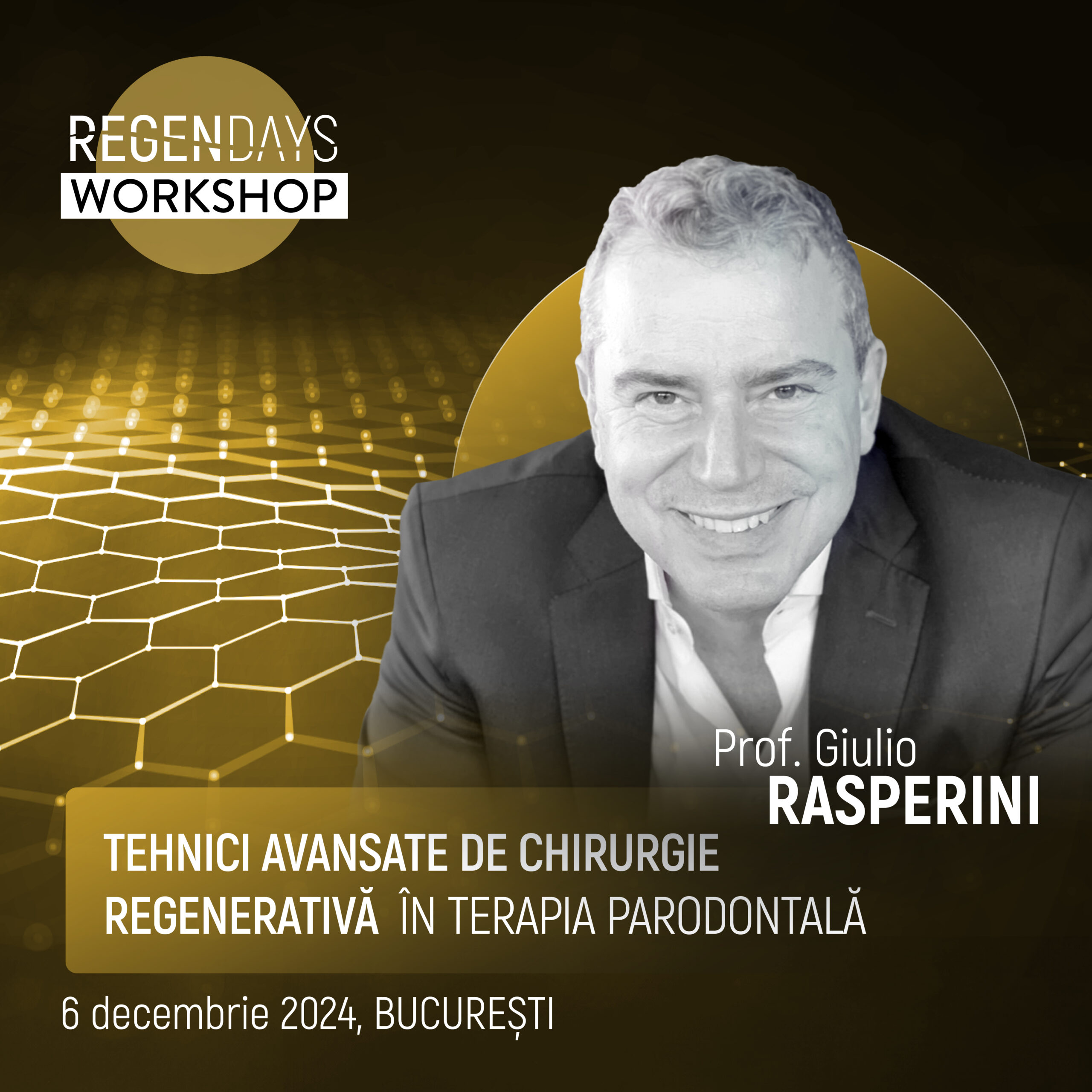 Acest workshop practic din cadrul evenimentului RegenDays 2024 îți oferă oportunitatea unică de a învăța și de a exersa tehnici avansate de chirurgie periodontală pentru regenerarea țesuturilor moi și dure ale cavității orale. Dr. Rasperini, expert în domeniul regenerării paradontale, te va ghida prin tehnici și abordări moderne care îmbunătățesc prognosticul și estetica în tratamentul dinților compromiși.